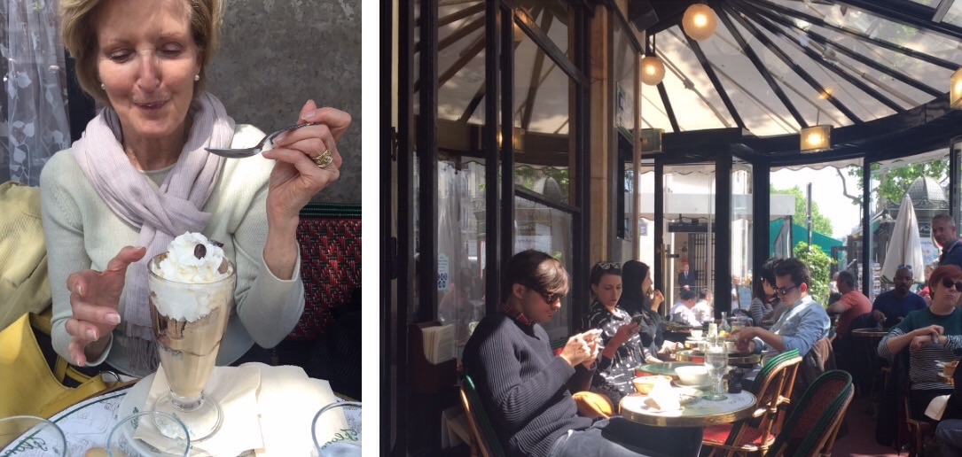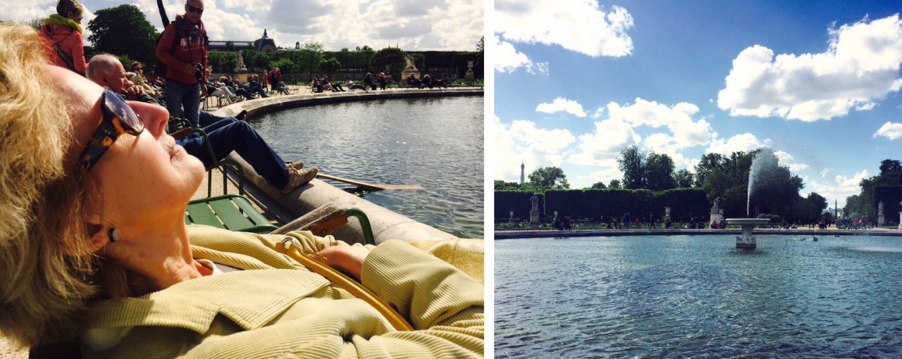 We ate dinner at Pièd au Fouet, a restaurant so small you could hardly turn around. I had the most remarkable profiteroles I’ve ever tasted at RUC across from the Palais Royal. We met up with Terrance Gelenter and his merry group of expats who gather every Sunday morning at Café de Flore. We relaxed in the sun by the fountain in Les Tuilleries. We have walked between five and eight miles every day. Tom has mastered getting around on Le Métro.