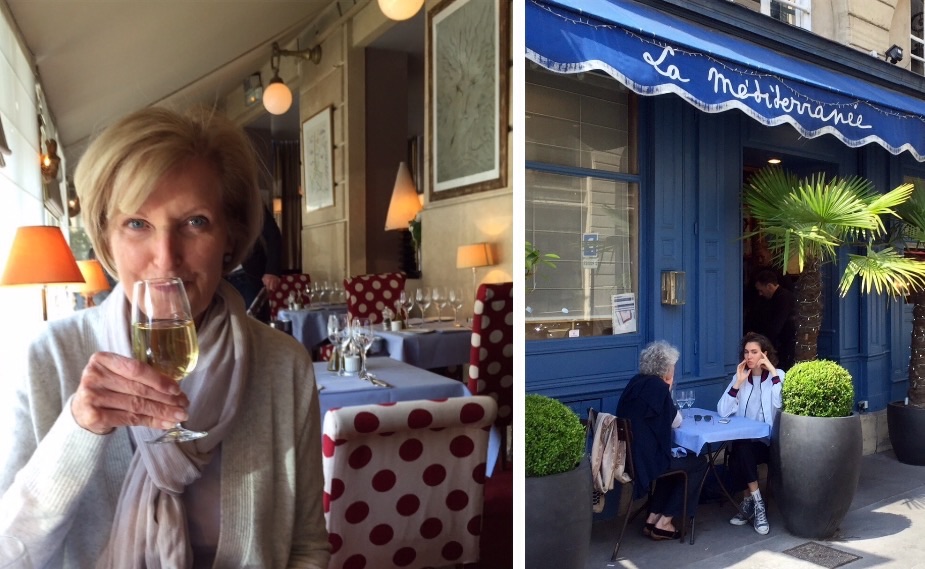 We discovered the Carrefour Odeon just yesterday. Less hustle and bustle. It leads you right to the Jardin Luxembourg and to the highlight of our day. We were lucky to find a vacant bench just inside the entrance next to a small meadow. Tom was napping in the sun so I decided to walk around a bit. Only a few steps from where we entered the park is the Jardin de Medici, an exquisite and lush garden with a statue and fountain at one end, swags of green and shade trees on either side that create a screen from the rest of the park. It is serene and magical. Today we returned for a picnic. What a treasure! We followed that with lunch at La Mediterranée…recommended by Cyril Guernieri, owner of Galerie Rauchfeld, and one of our “neighbors”… not only one of the loveliest restaurants I’ve ever been in, but also some of the best food we’ve had so far.