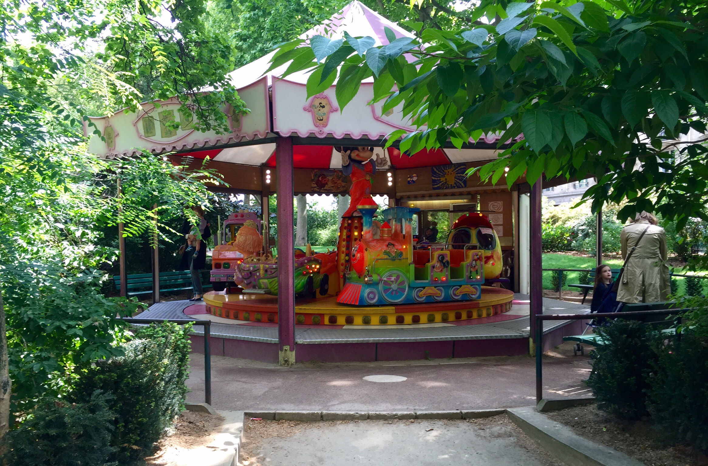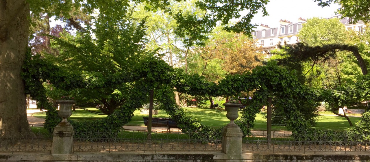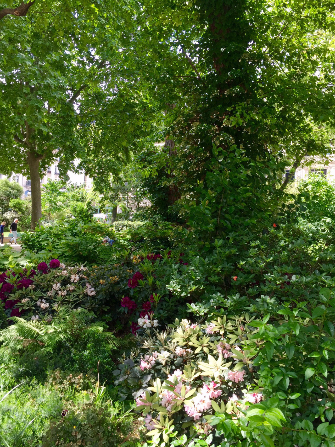 While he ogles this “wall of chocolate”, olive oil and fois gras, I’m salivating over handbags of butter soft leather. I worked my way around to scarves and found a lovely one. I didn’t hesitate. It certainly cost less than the handbag I had my eye on! I made it up to the second floor but had to leave to meet Tom or else I might still be in there….. We agree to meet in the beautiful little park across the street from Bon Marché. Another surprise.