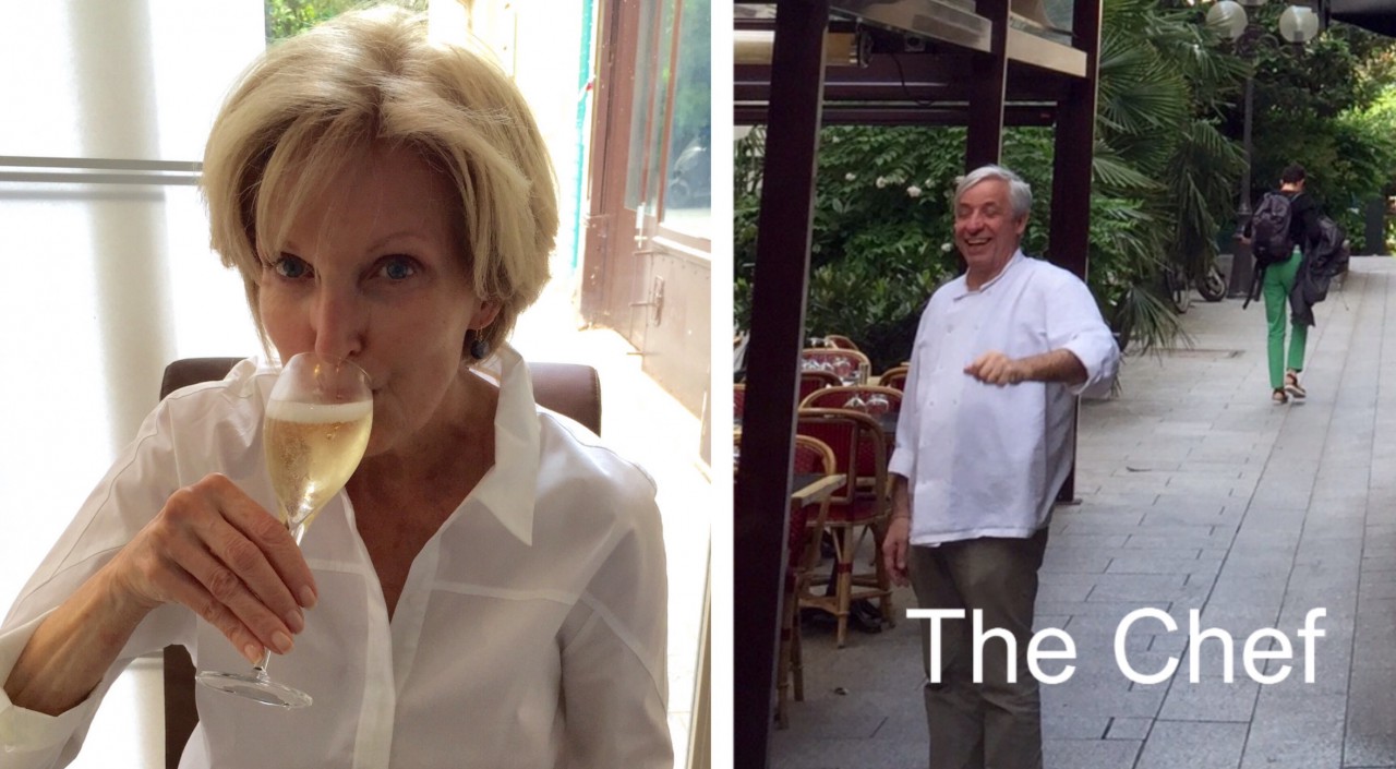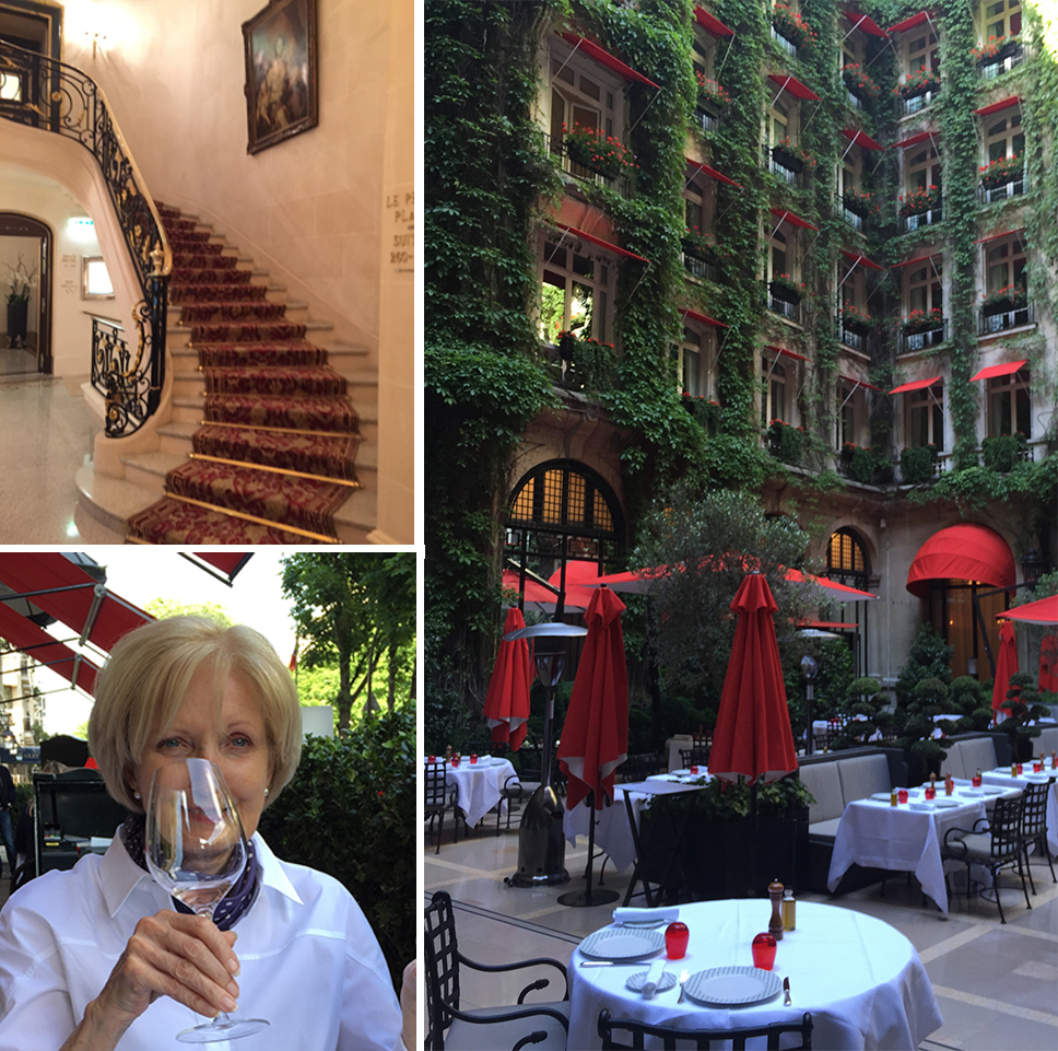 Unlike some other hotels recently unveiled after the owners, architects and designers almost strip them of their character, this hotel (we only saw the main floor so cannot speak to the sleeping rooms) is lovely after major renovations, but not at all the same, except for the exterior, as when Moose stayed there (to explain. His given name was Maurice and he was Tom’s father. “Moose” was the nickname given to him by his college football team…rather humorous for the slender 6 foot 2 inch gentleman he was. His given name was Maurice!) Long after his college days he was always known as Moose, by his wife and friends, and even when he sat at the head of the table as Chairman of the Board of Armstrong Industries). I was sad to miss seeing the Plaza Athénée as he did. We sat on the terrace because it was a lovely day. I think if the hotel was the same today as when Moose was there I would have chosen to sit inside – rather like sharing it with him. The staff at Plaza Athénée was so welcoming and gracious as we told them about Moose having stayed at their hotel many many times. We were taken on a tour of the main floor and even invited to see a sleeping room if we wanted. Perhaps we should have but Champagne was calling.