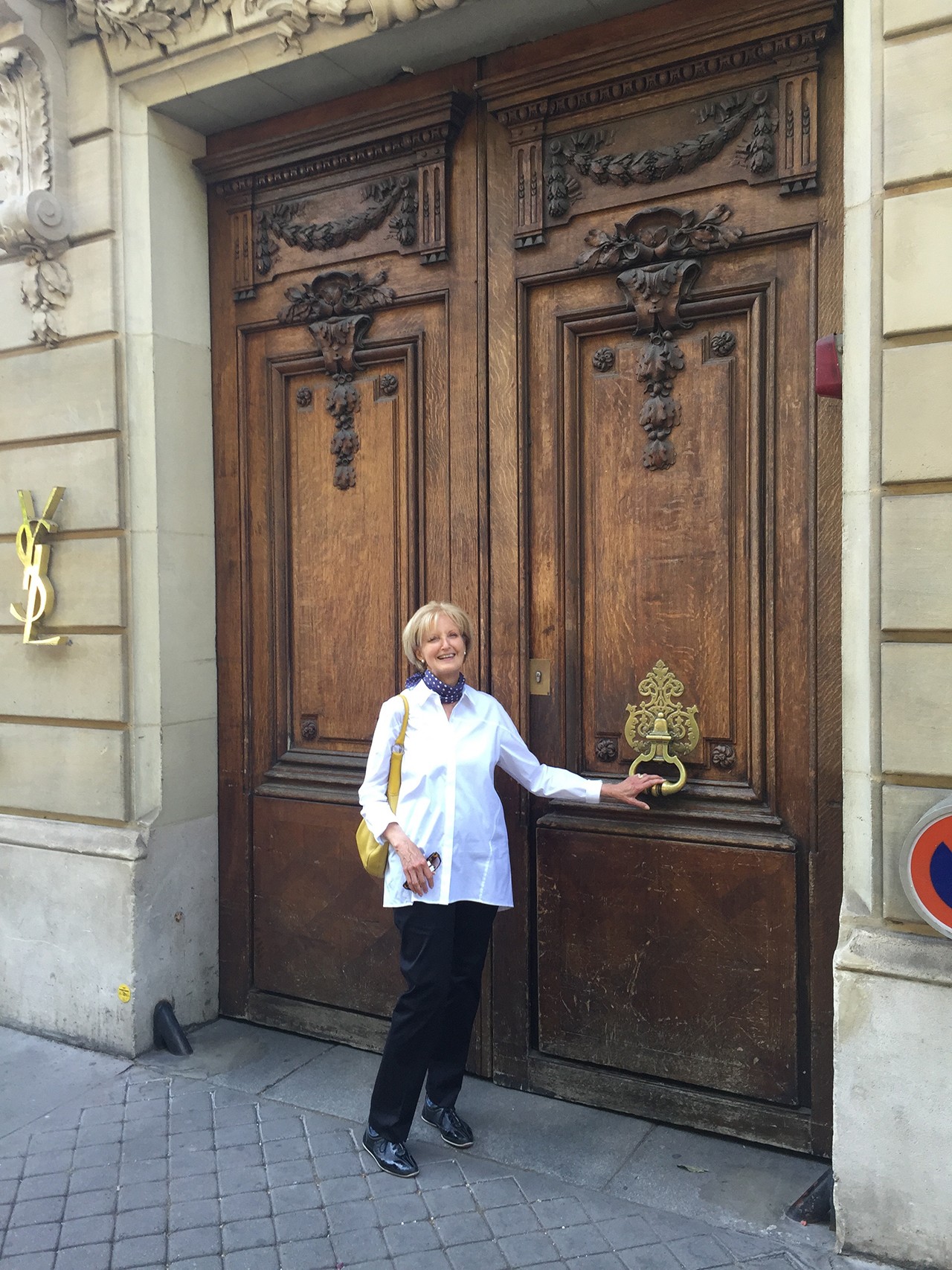The city is familiar now. We love our neighborhood. The lady in Carton now sells me baguettes with a wink and a smile. The gentleman who owns the Pharmacie close by is friendly and has been most helpful when we needed it. When we go now to pick up a few things he recognizes us and comes out from behind the counter to find what we’re looking for. The lady at the dry cleaners does not ask us to pay when we drop our clothes off. The other night after dinner in, I nudged Tom into going for a walk. It was 10:00 pm yet still light. We walked up a street we had not been on before, eventually coming to an intersection where some musicians were playing….as we got closer we could see a woman dancing. At first I thought she may have been passing by, but when the music stopped she took a little bow and stepped back to stand next to the trio. In less than a minute they began playing again, and out she came. A “woman of a certain age” (perhaps 75 or 80), she was dressed in a skirt with little bits of delicate fabric peeking out from the hem, topped by a long sweater. There were rings on her fingers and decorations in her hair. She wore more makeup than she needed. She moved to the music in a rather staccato fashion, repeating the same step over and over, then twirling around holding her skirt up a bit. When she turned in our direction I could see her eyes. They revealed a faded sparkle that she seemed to be holding onto. Perhaps she danced for the joy of it, perhaps she danced for the few coins she would get at the end of the night. Perhaps she was a good friend of someone in the trio…her expression seemed to me to be one of “It’s not the same now. For now this is what I can do”. I looked up into the sky, now dark, and at the cafés around us. Elsewhere in the world all kinds of things were going on. People getting up. Going to bed. In their offices. Picking up children from school. Paris is just Paris. One poignant moment after another. 🌾🌾🌾 I love the door to our apartment. It’s not a fancy door. There is a very simple handle high up on the left you can use to pull it shut when you leave. There is a small pull in the middle of the door – small in scale for the door size, mounted just where one would place a door knocker. I think that came later.