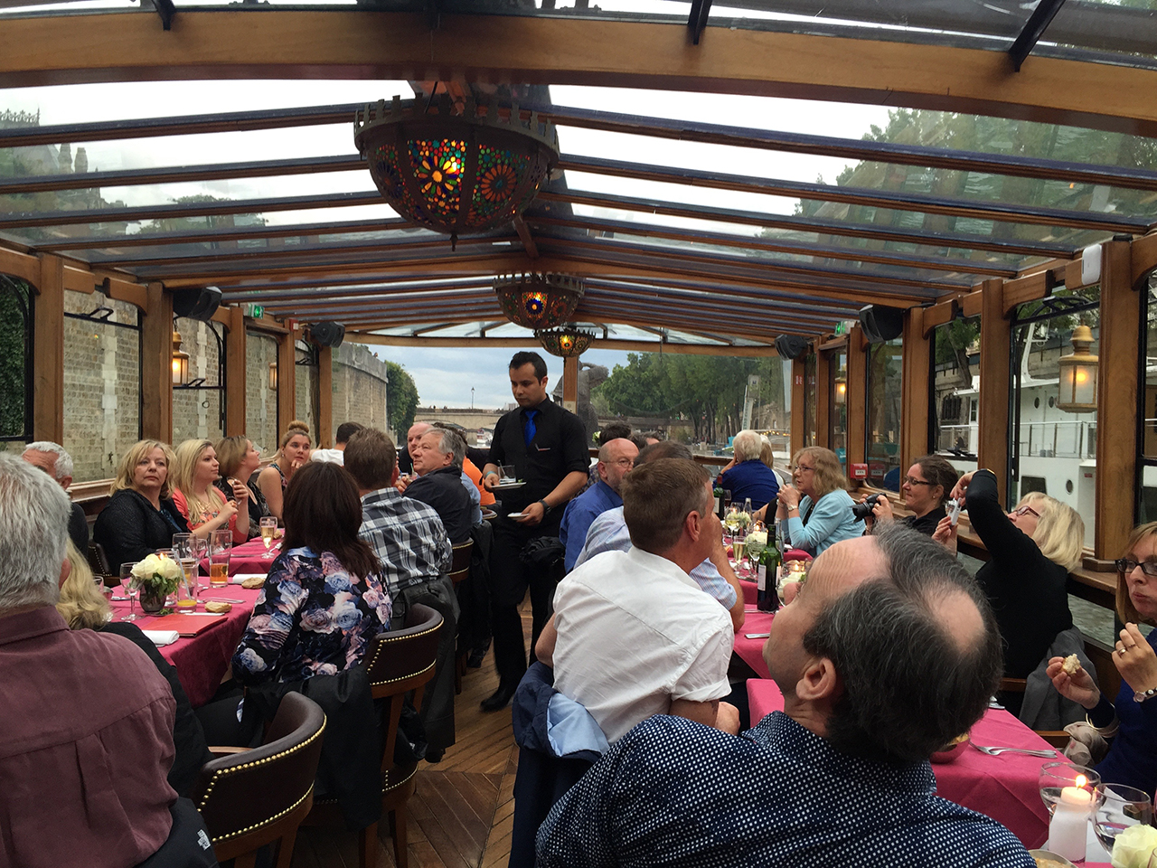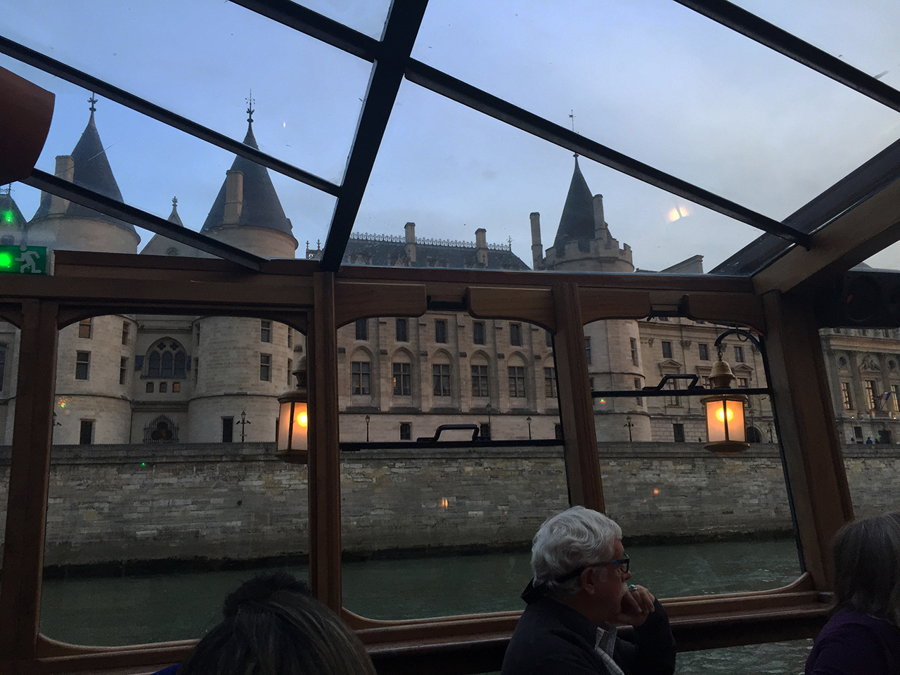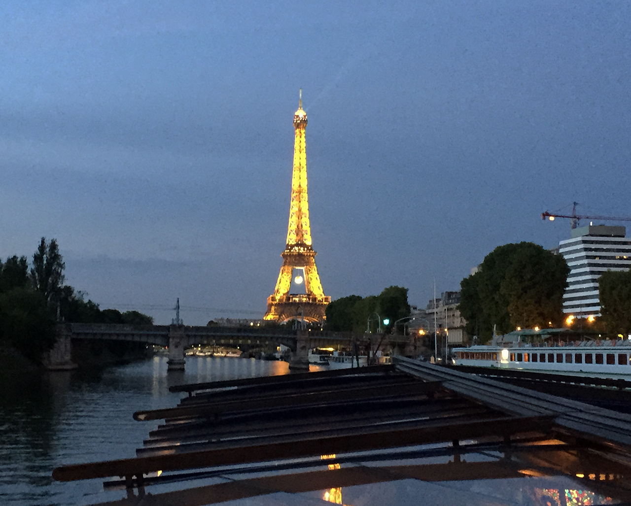 We took a dinner cruise down the Seine … on the El Calife … Tom nudged and hinted for days, saying he had read good reviews and was certain it would be a fun evening. He was right, it was fun. Pleasant dining companions, good food and great scenery …. all a mere ten minute walk from our front door to the dock, far more pleasant than dashing about with the métro and a moonlight stroll back to our apartment.