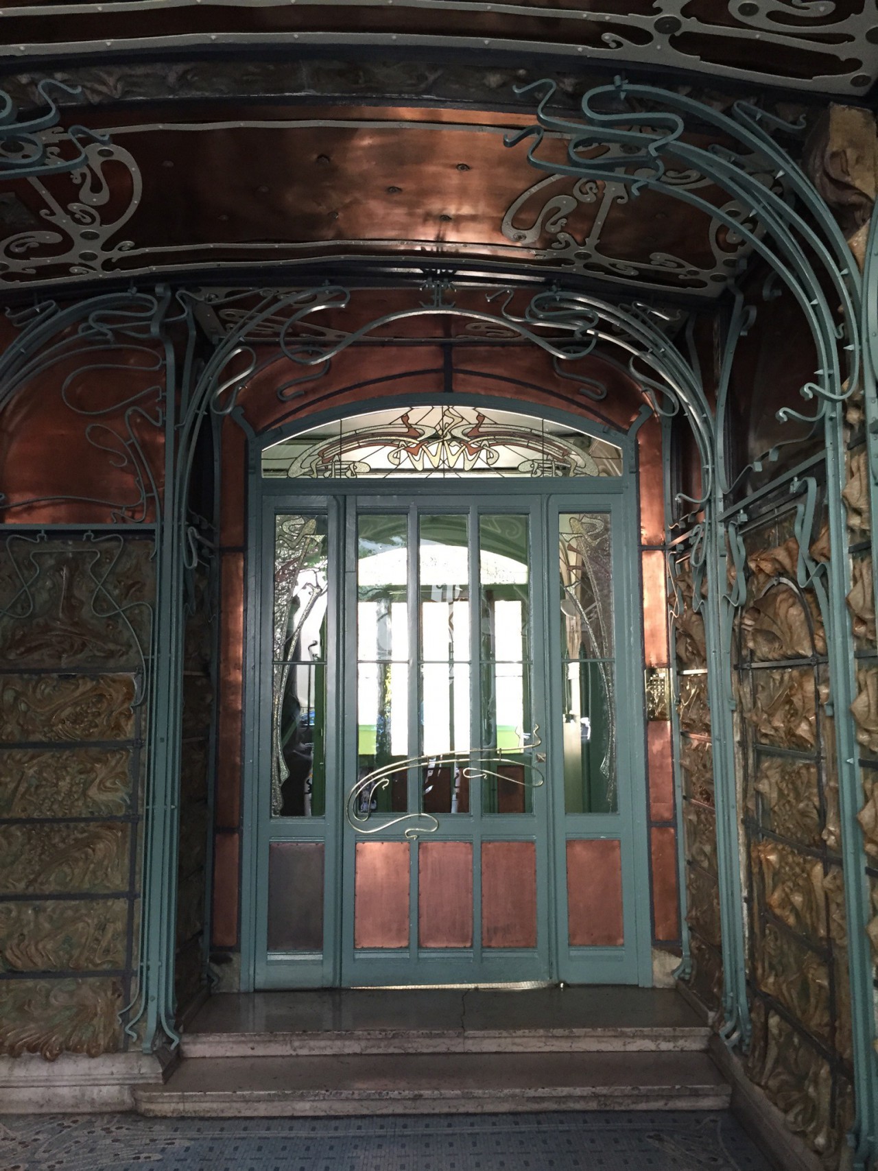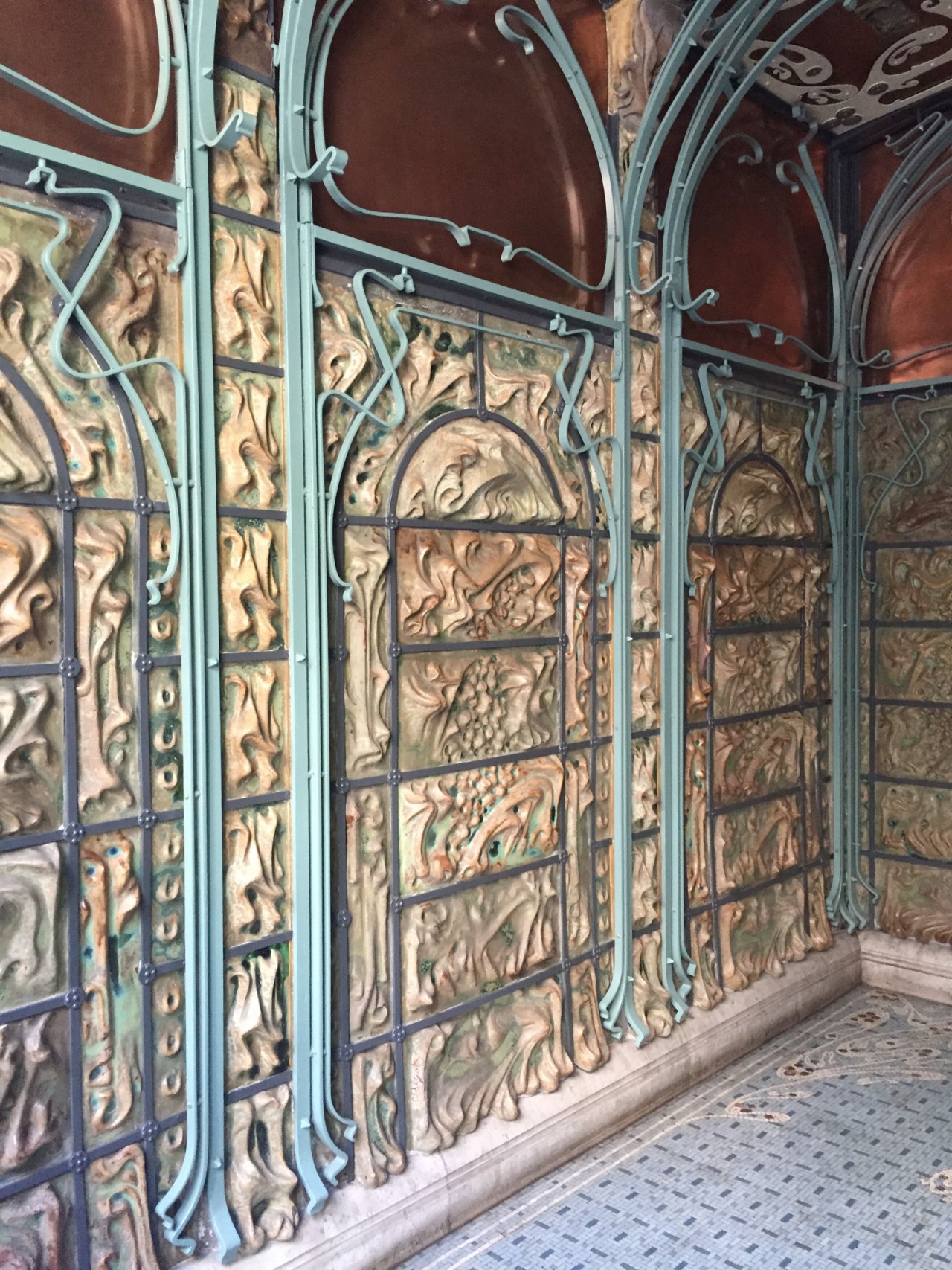 Best-known works by Guimard are entrances to the Paris Métro, which was completed just in time for the 1900 World Exposition. By 1903 he had designed numerous Métro entrances. Eighty-six have survived …. you’ve seen them no doubt. They are one of the things Paris is famous for. We have all passed under them as we walk down the stairs to catch a train, or leaned against the railing to talk to a friend or read a map. His fanciful designs combined wrought iron, bronze and glass to create these grand and graceful entrances.