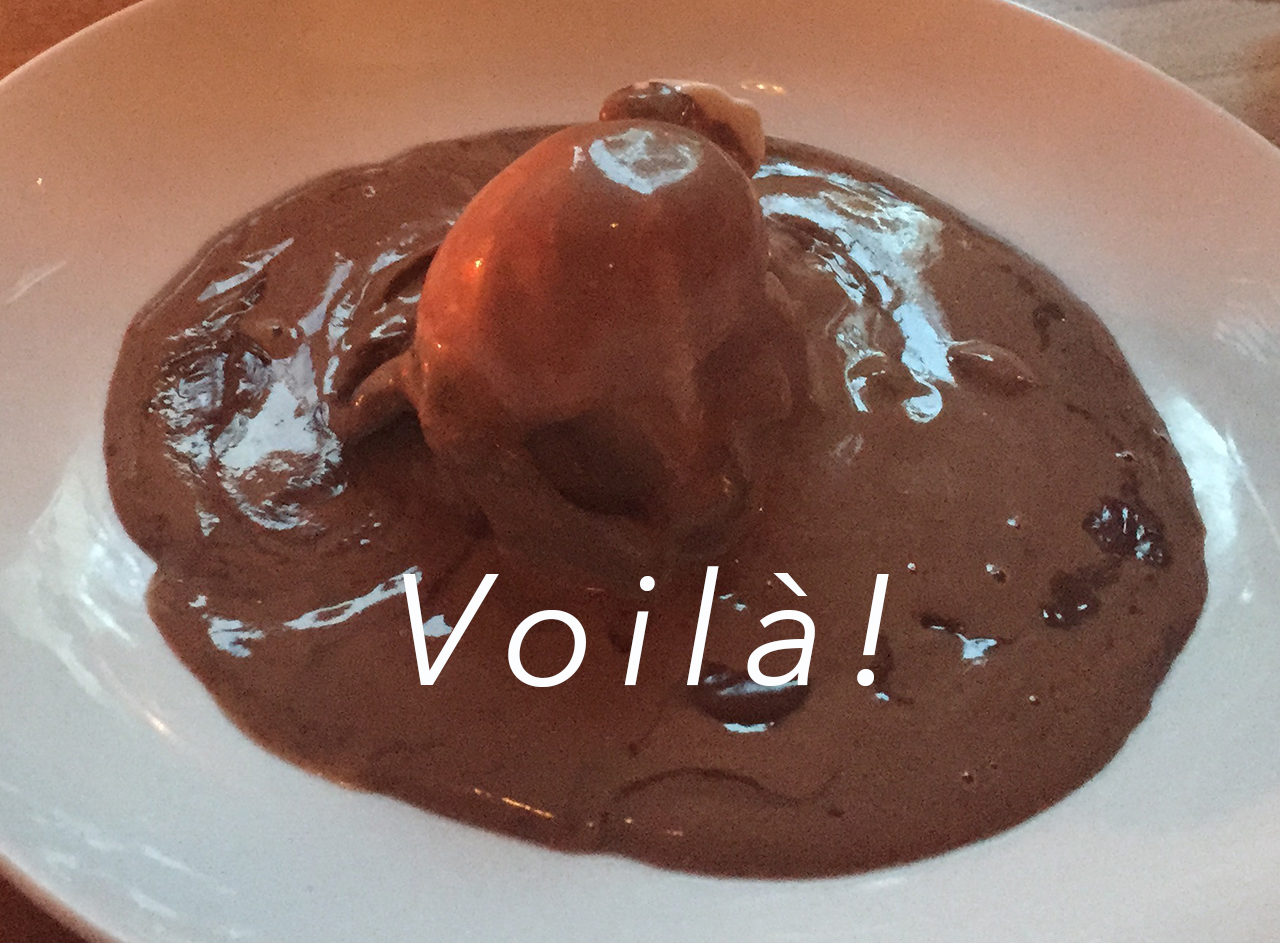 The magical dessert Tom ordered is presented in a shallow white bowl with a sphere of chocolate resting in the center. It begs to be cracked open, but patience is the key here. The waiter has in his other hand a small pitcher of hot chocolate syrup which he pours slowly over the chocolate shell, melting it away. The reward: a scoop of ice cream in a pool of warm velvety chocolate…..now you can reach for your spoon!