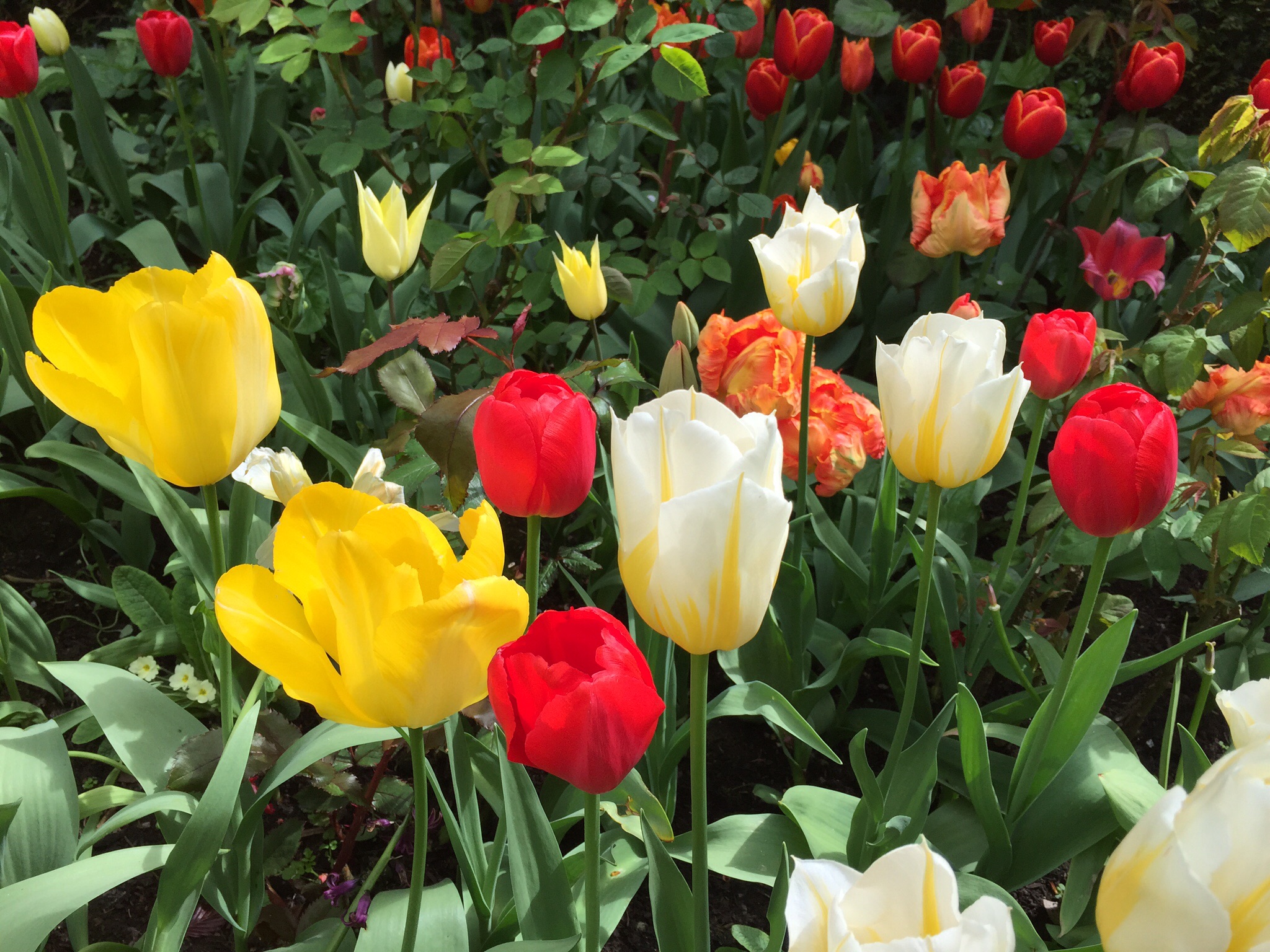 We drove a very old and narrow one lane road (narrow meaning the width of our car!) lined with old stone walls and houses with roof tops covered with lichen. We had a delicious lunch at The Lamb in Burford. In Lechlade we were to visit a church to see the stained glass windows but it was closed, so we walked the cemetery with markers so old the words not legible. Dinner at The Potting Shed across the street from our hotel. The next day a visit to the Abbey gardens in Malmesbury. The tulips were blooming in profusion and in every color you can conjure up.