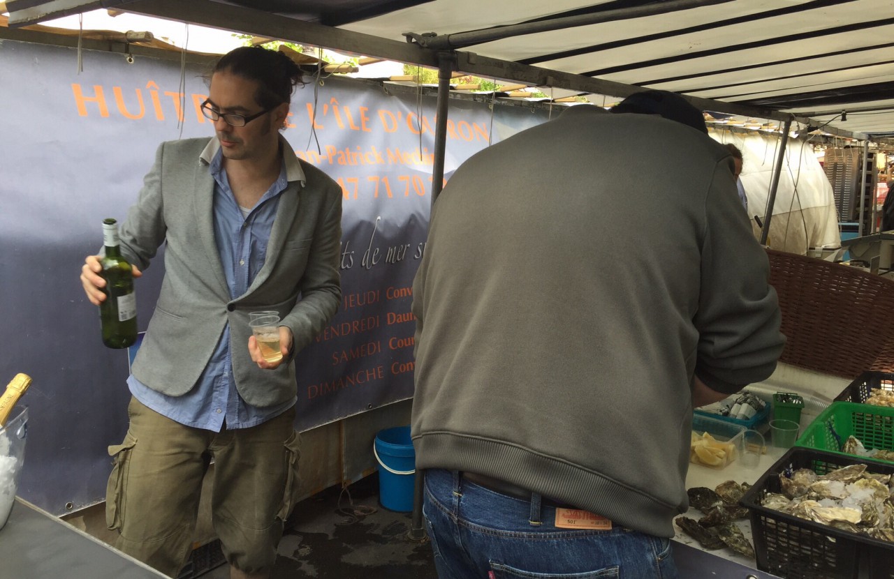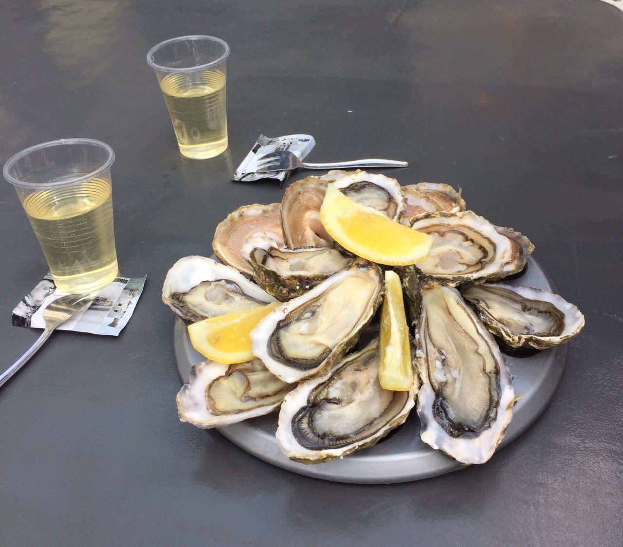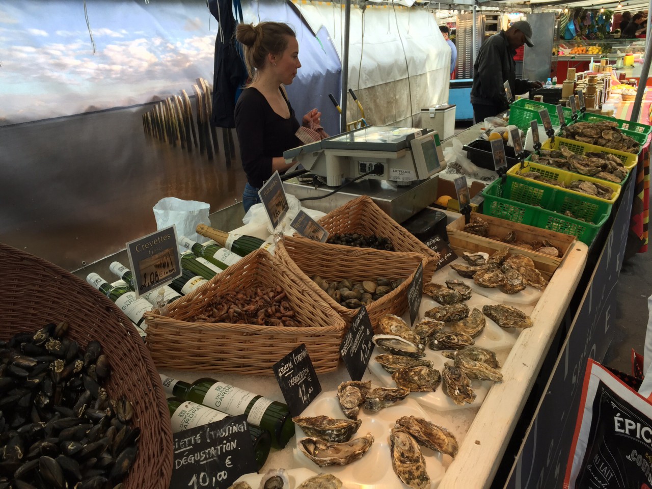 At 9:00 am we set off to the blvd Raspail and the street market to find a roast chicken Tom read about. Marinated in seasonings for days. Tender and perfect. We only knew to look for “the chicken lady”. Easier said than done. Only hundreds of stalls to maneuver through, the first ones with scarfs and socks and kitchen utensils and Russian dolls, etc. then the fish (phew!) and then the produce, but no chicken lady…… Our shopping bags are full of everything but chicken. The logical thing to do was – EAT – I don’t know about you, but I’ve never had white wine and oysters on the half shell for breakfast, but there we were…around 10:30 am doing just that! And it was fabulous! We tried two kinds of oysters, Belôn and another called “Royal” that had the most amazing flavor.