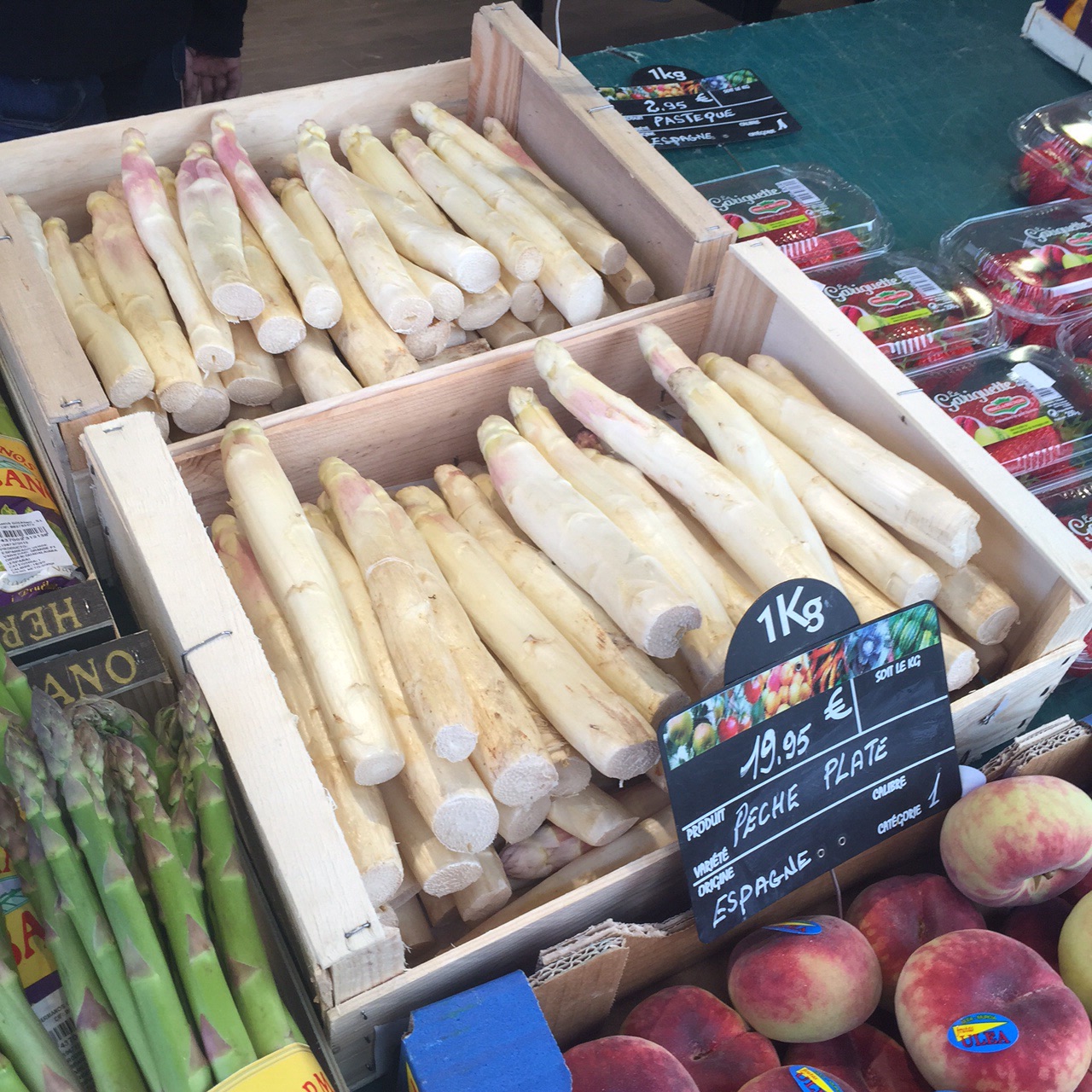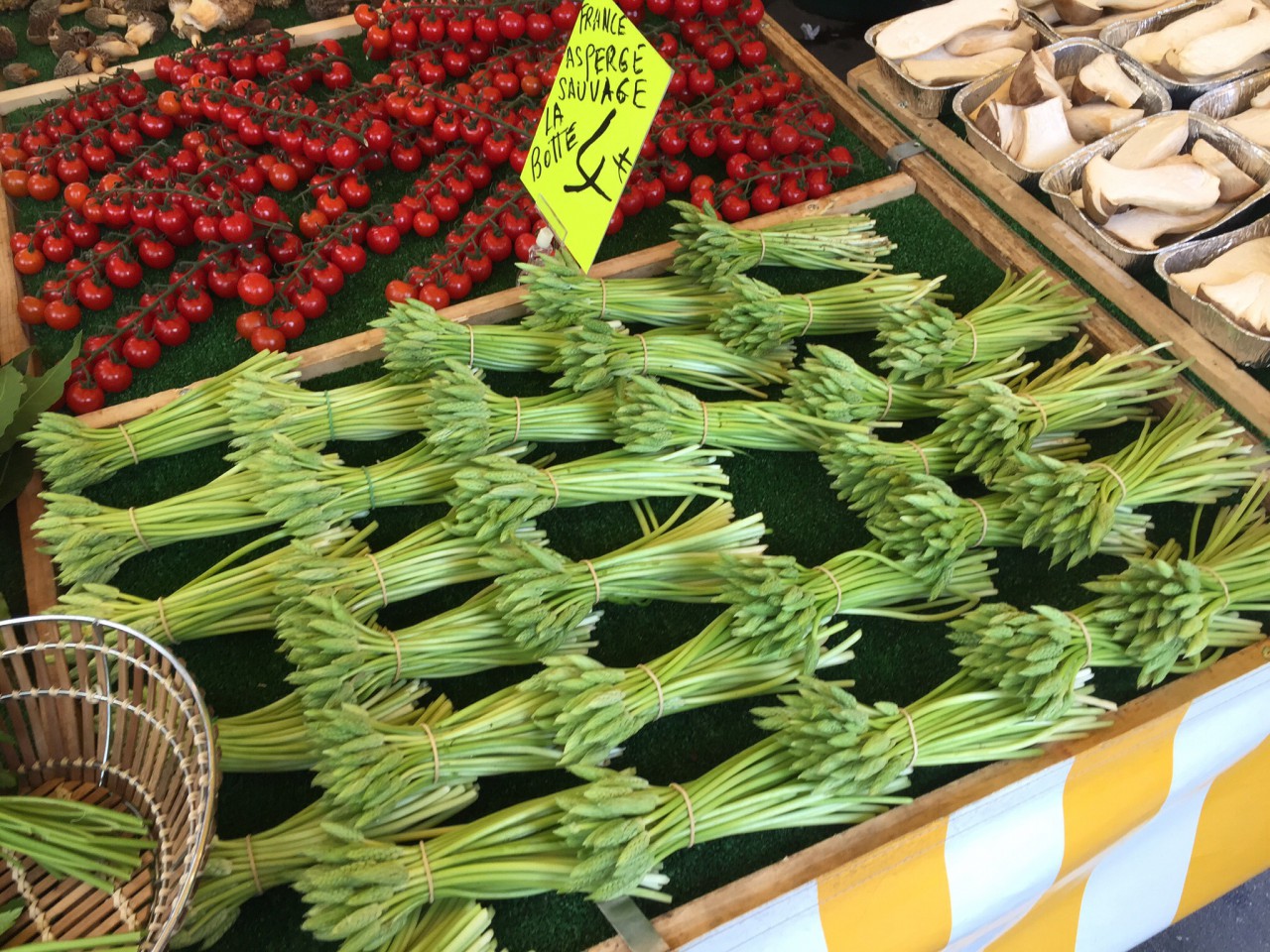 We decided to ask Monsieur Oyster Guy, who spoke English, if he knew about the chicken lady. He didn’t. He would ask. He pointed to a woman across the way and we weren’t so sure, but we bought her roast chicken. Now you might think this little adventure has a happy ending, but it’s only marginally happy. The chicken was dry and tasteless, so no marinating happening in her farm kitchen! We did discover young asparagus…. Now keep in mind this is France. Someone discovered if you pick asparagus at the point that it first sprouts, or whatever it does when it begins to grow, when the top 1/4 inch has some little recognizable asparagus like bumpy bits on it, and the stalk is thin, like a clover stem, only longer, well you gather them up and bring them to market!
