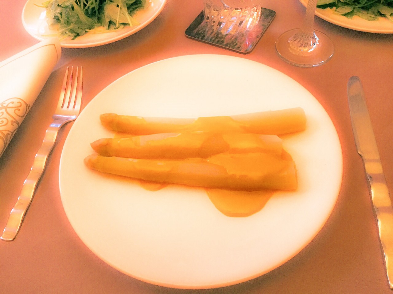 So now it’s day 4…technically day three according to my calculation since we arrived late afternoon. Find the wine shop. Take clothes to the dry cleaners, make a hair appointment. Pick up things for lunch and dinner to eat at home. White asparagus is in season – Tom is salivating! For our dinner he serves it with fresh hollandaise sauce along with two mini quiche. The fat white stalks of asparagus are sweet and tender and we’re feeling quite pleased with ourselves.